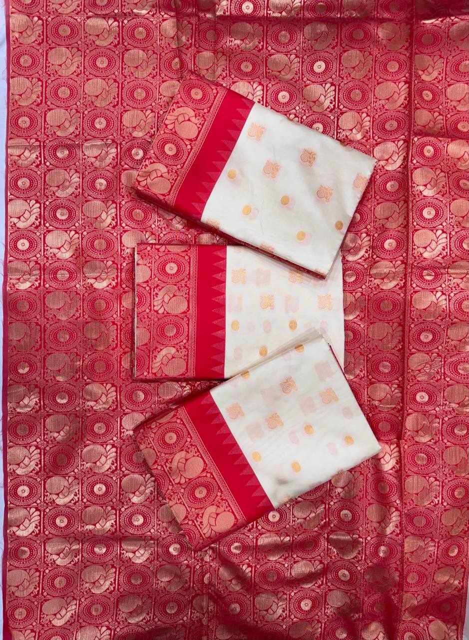 Design: Beautiful rich pallu with exquisite jacquard work woven all over the saree, giving a graceful and luxurious look
